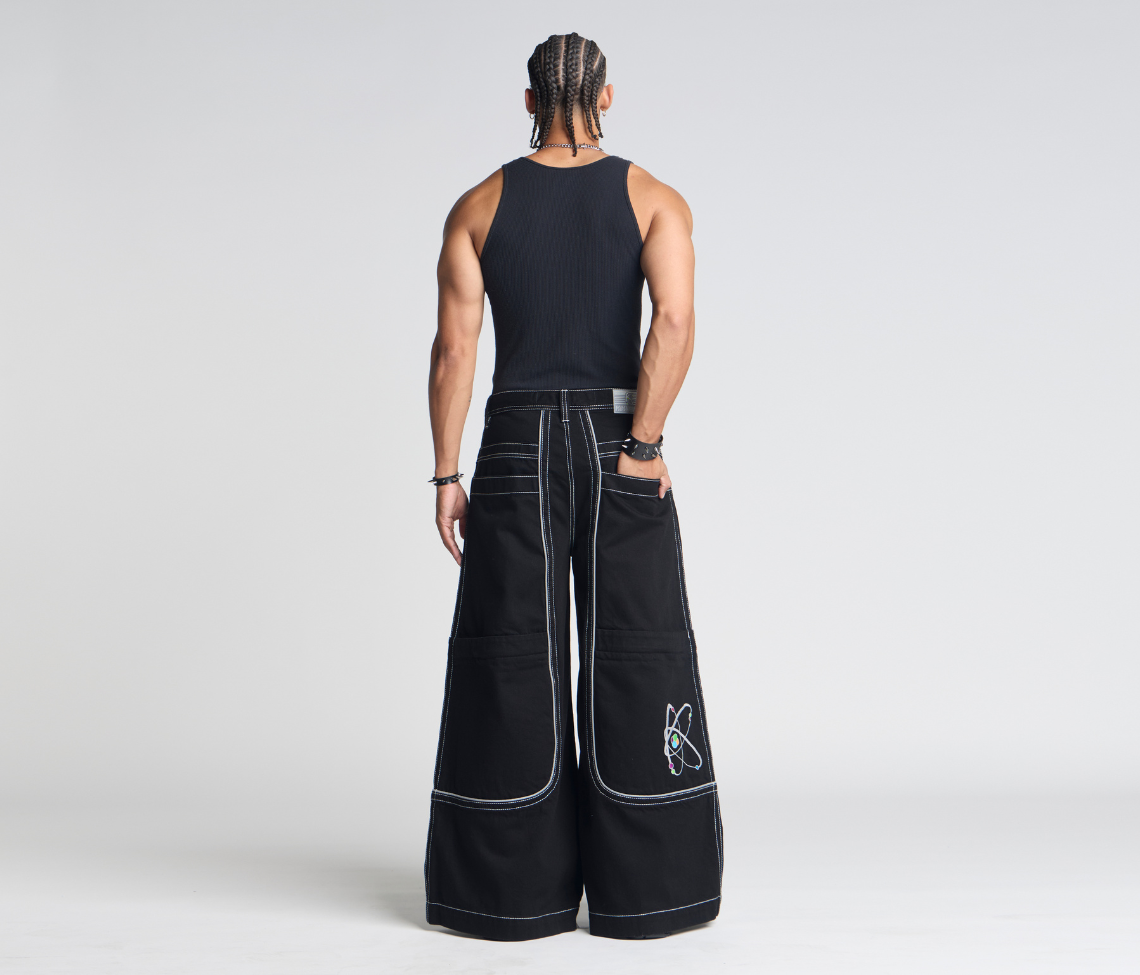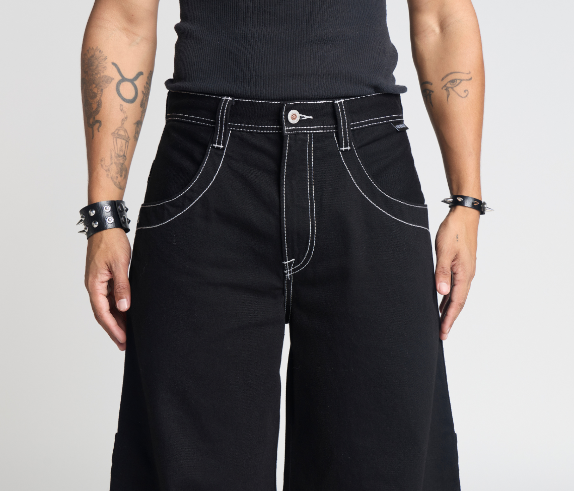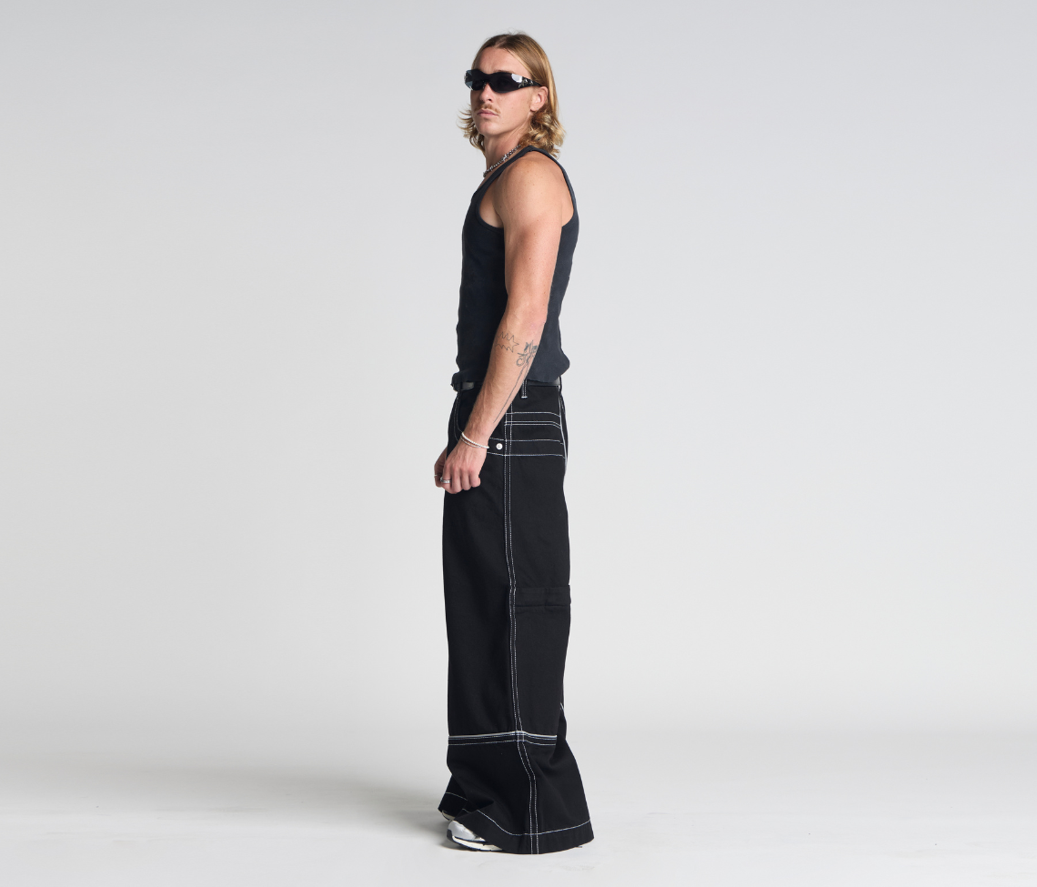 34" BOTTOM LEG OPENING | 26" DEEP BACK POCKETS | 13" ZIPPER COMPARTMENTS | Super Black Rinse