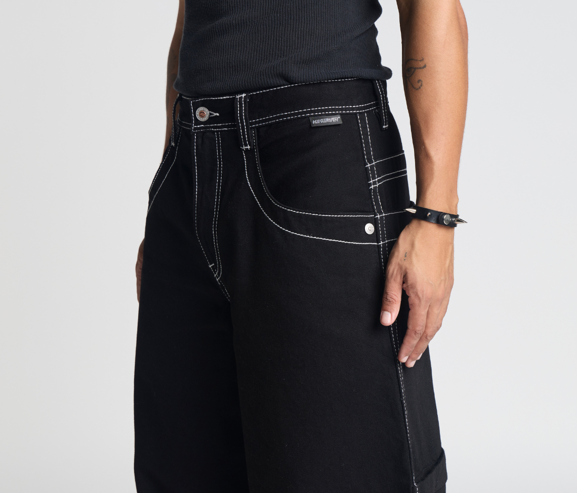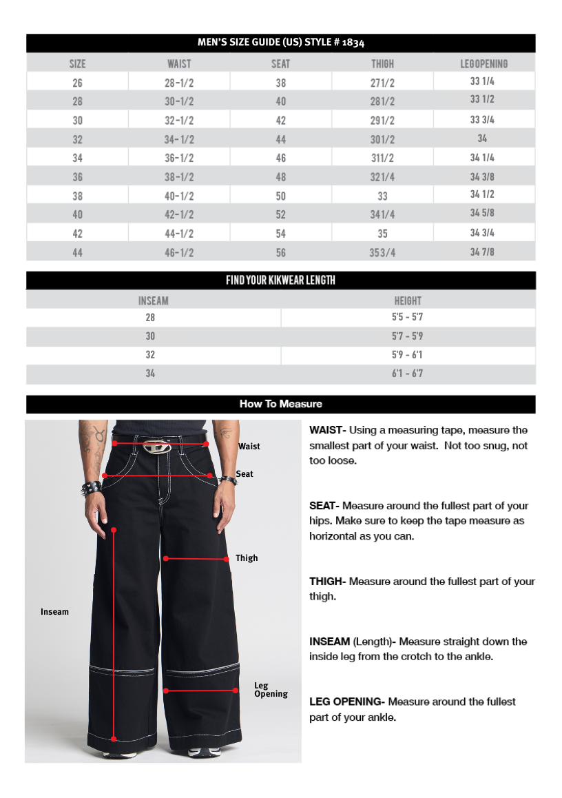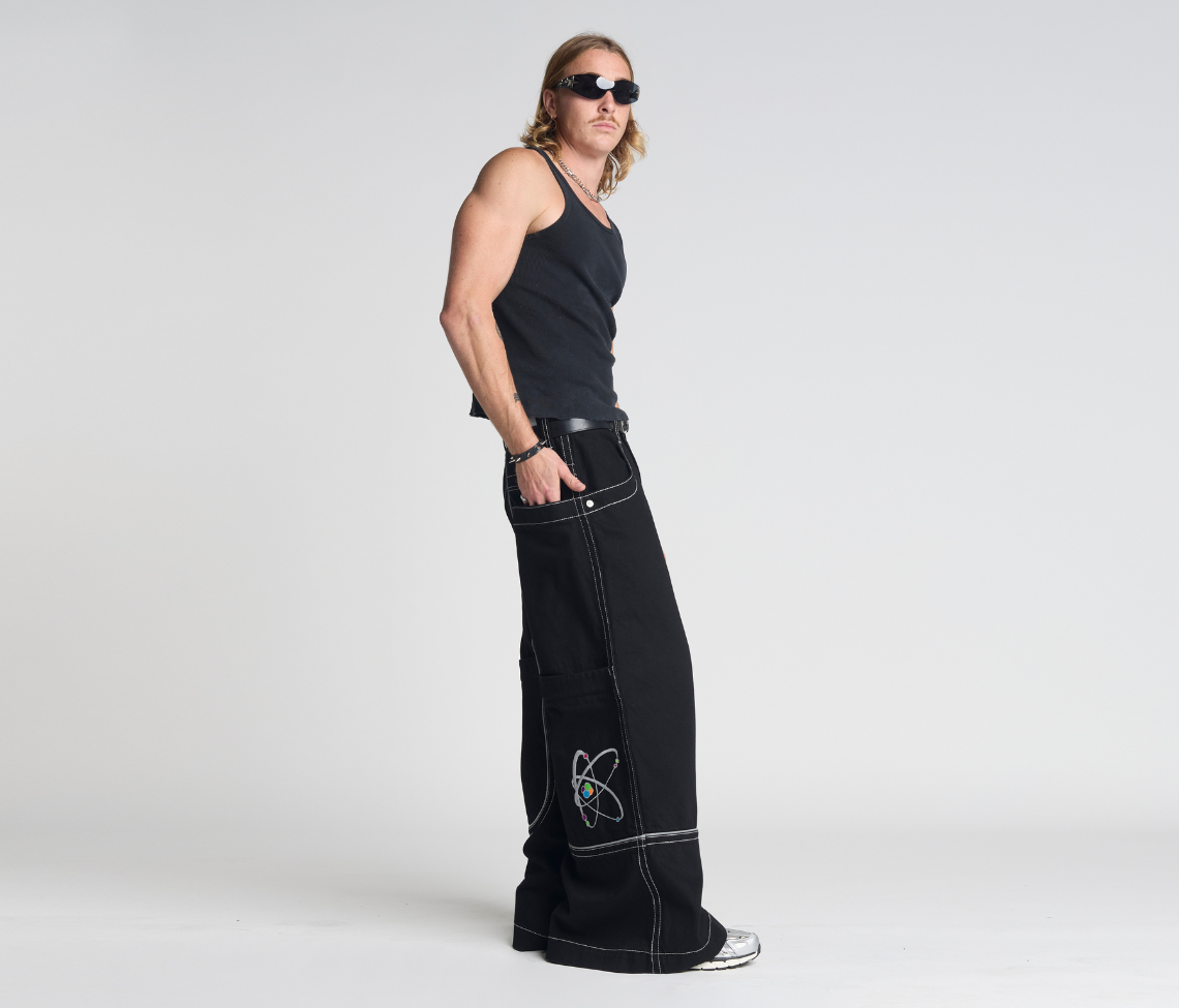34" BOTTOM LEG OPENING | 26" DEEP BACK POCKETS | 13" ZIPPER COMPARTMENTS | Super Black Rinse