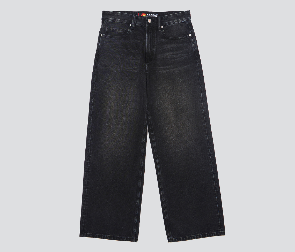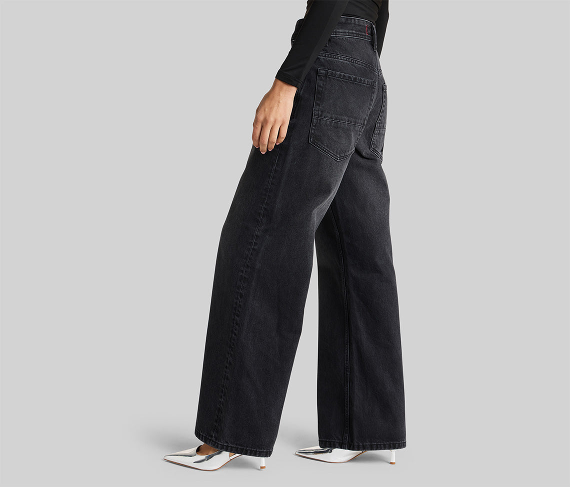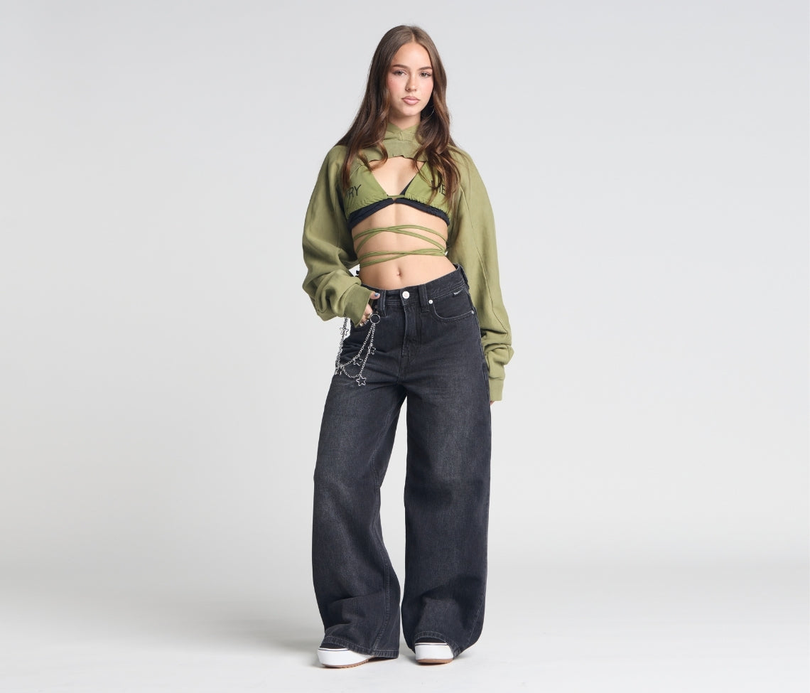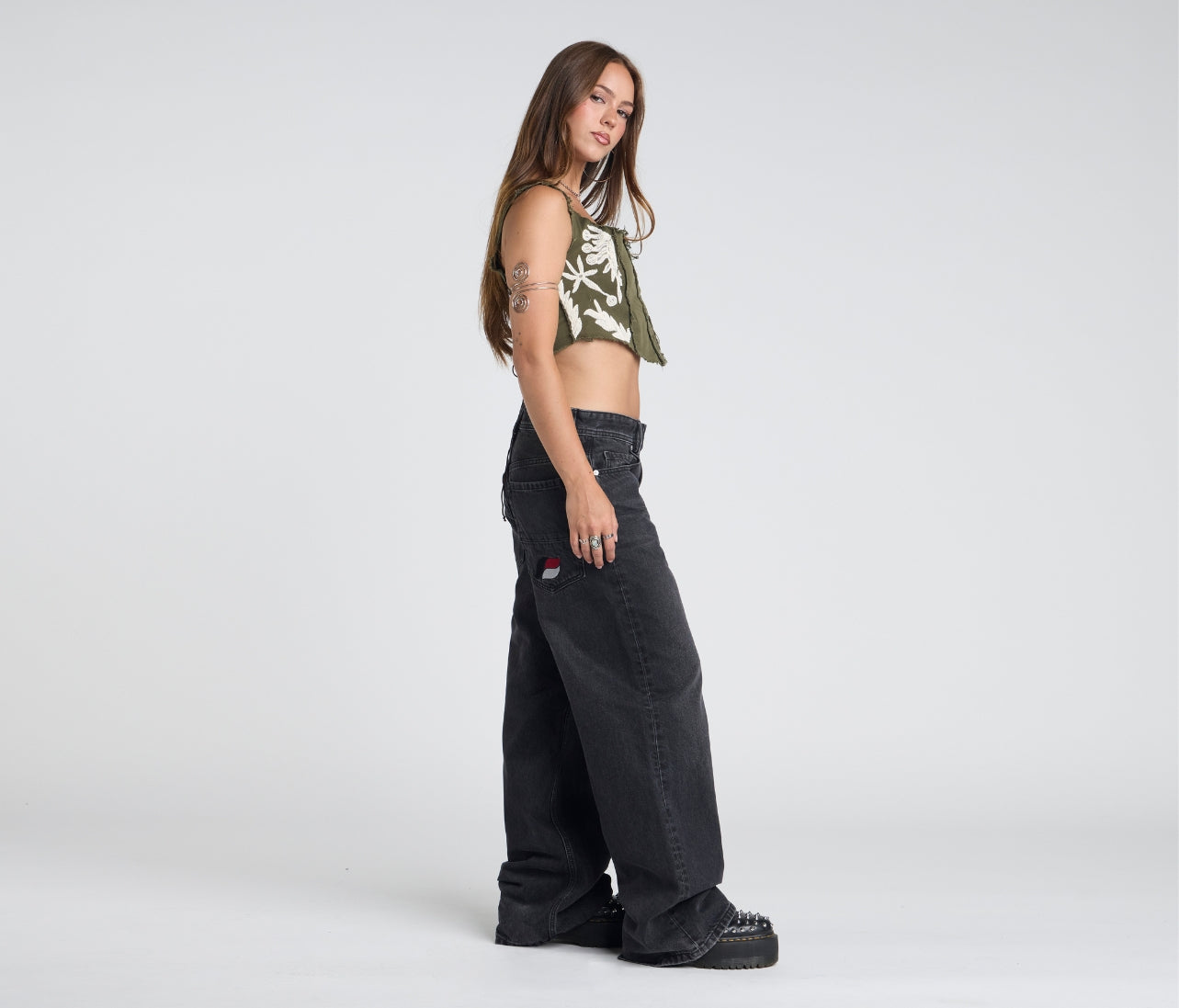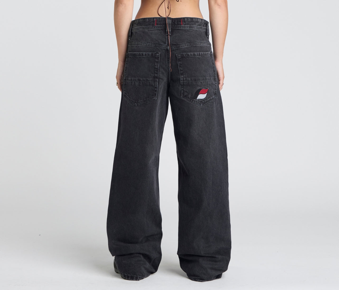 Sits below the waist with a longer rise. Baggy fit through the hip & thigh.