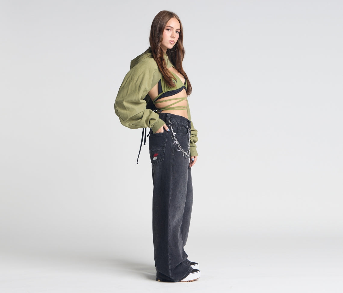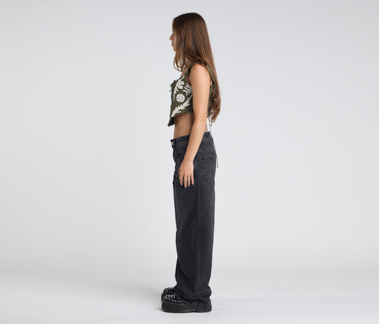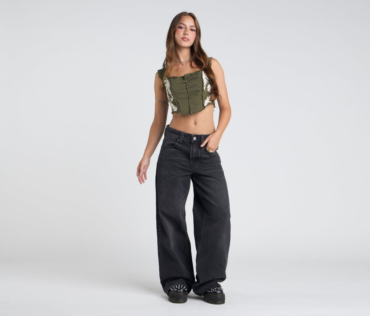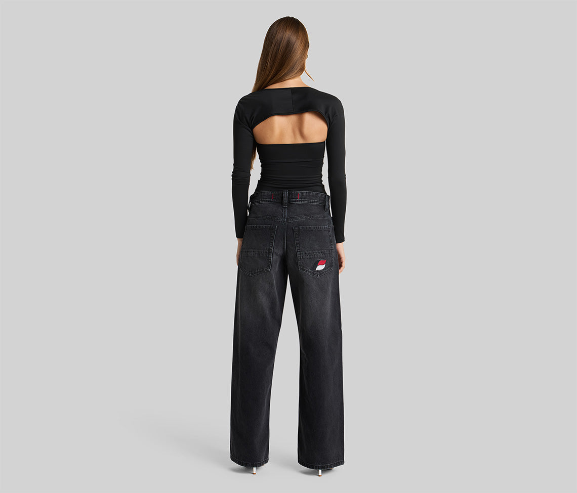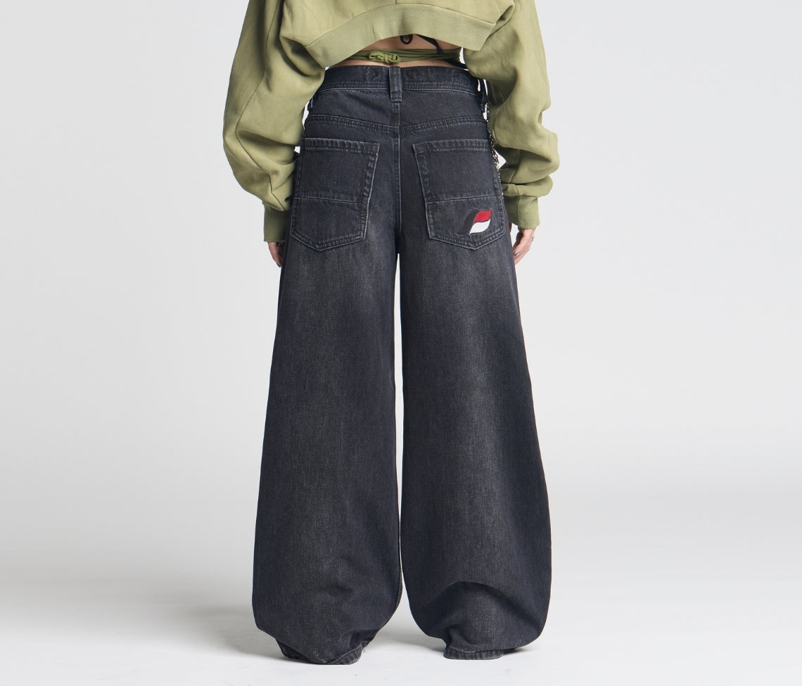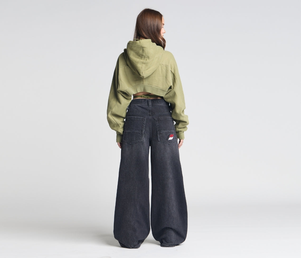 Sits below the waist with a longer rise. Baggy fit through the hip & thigh.