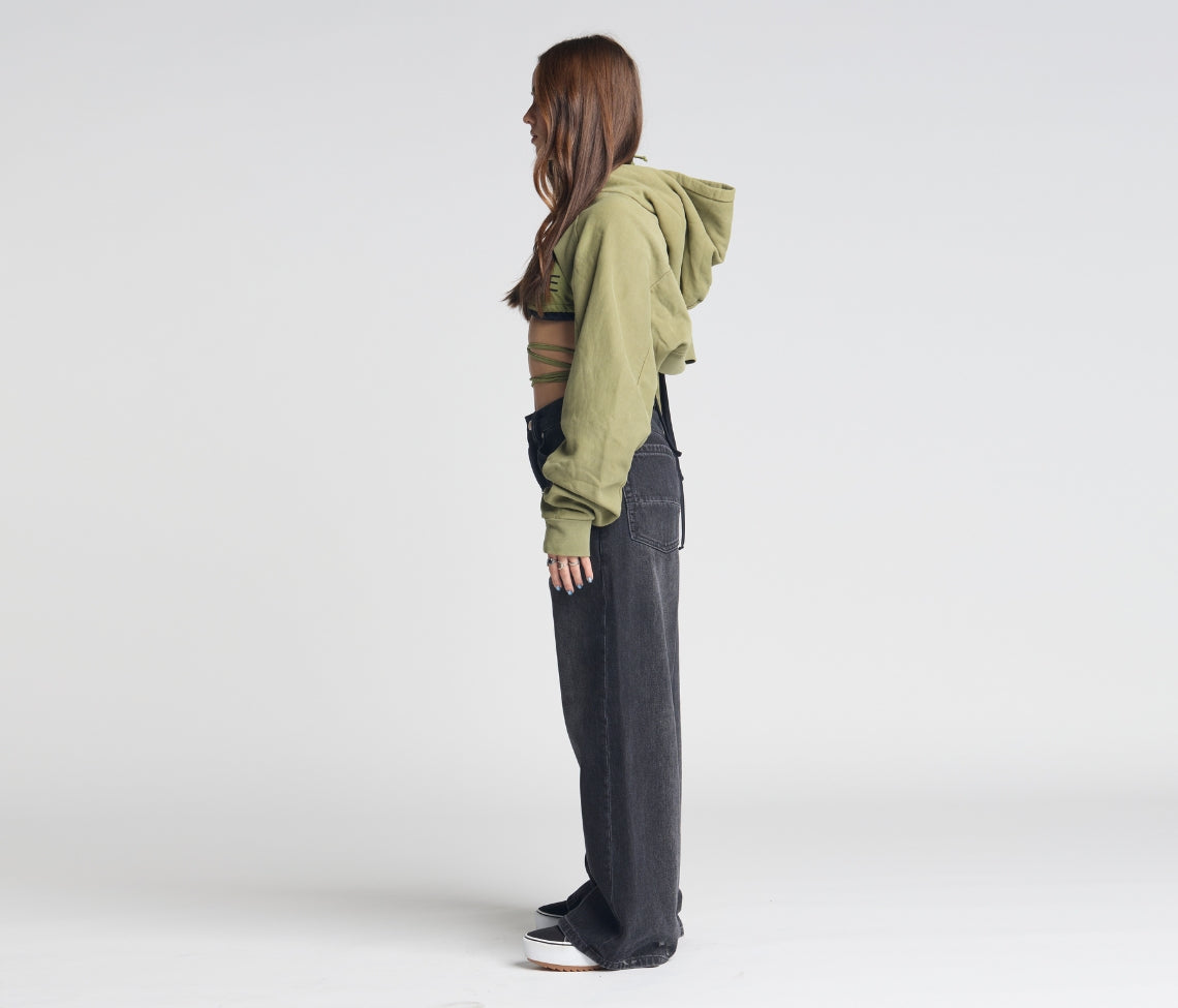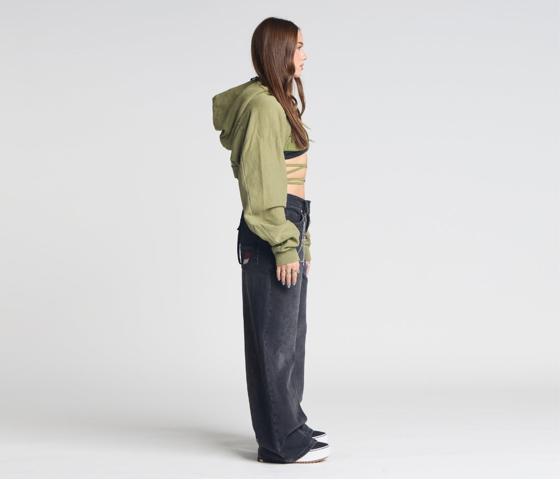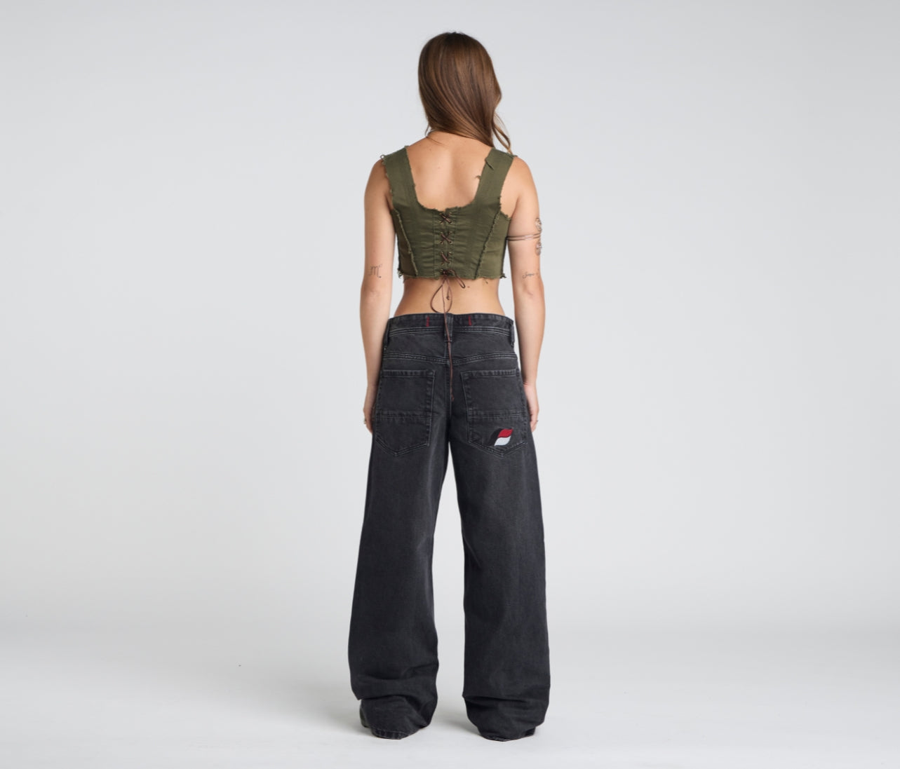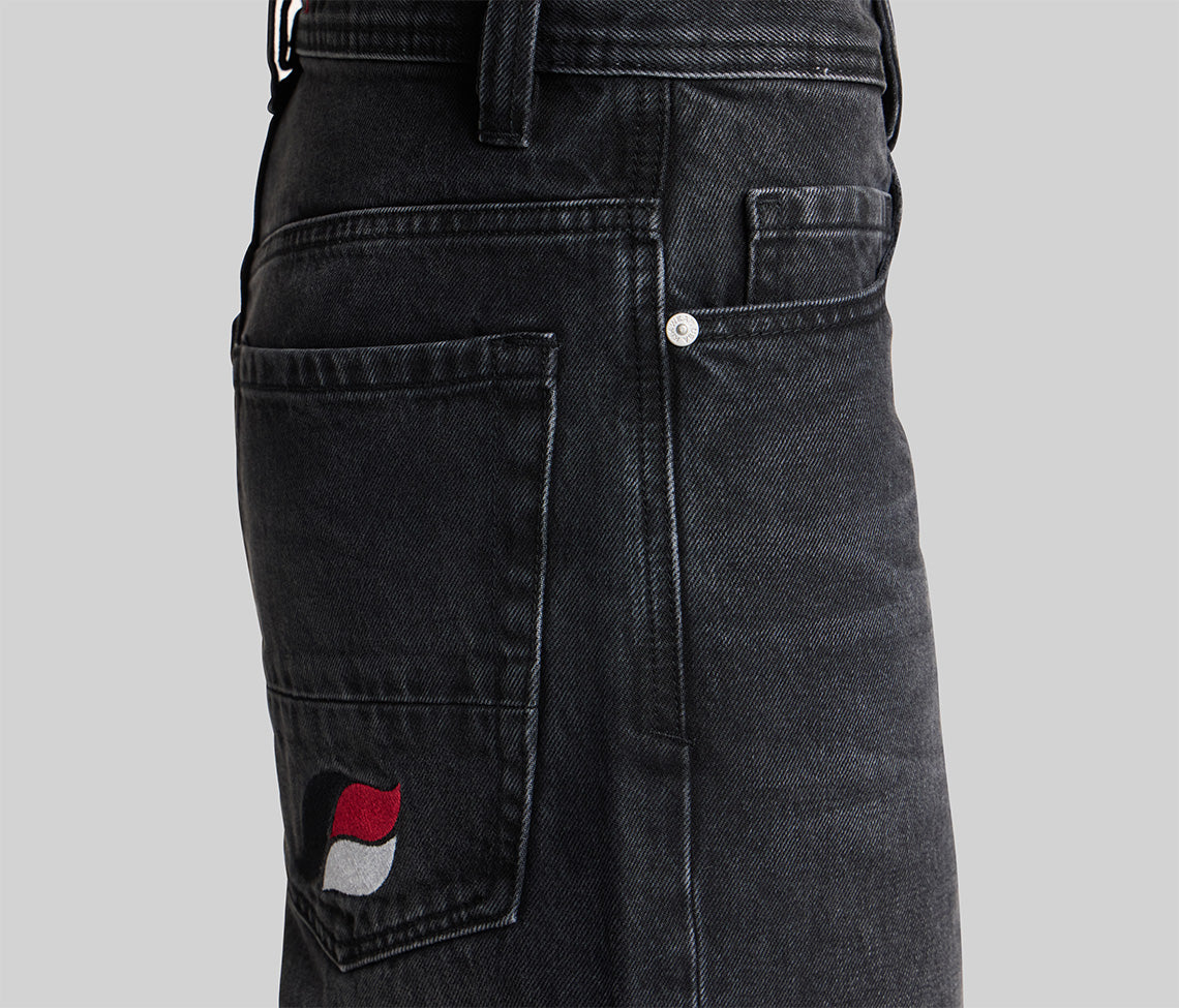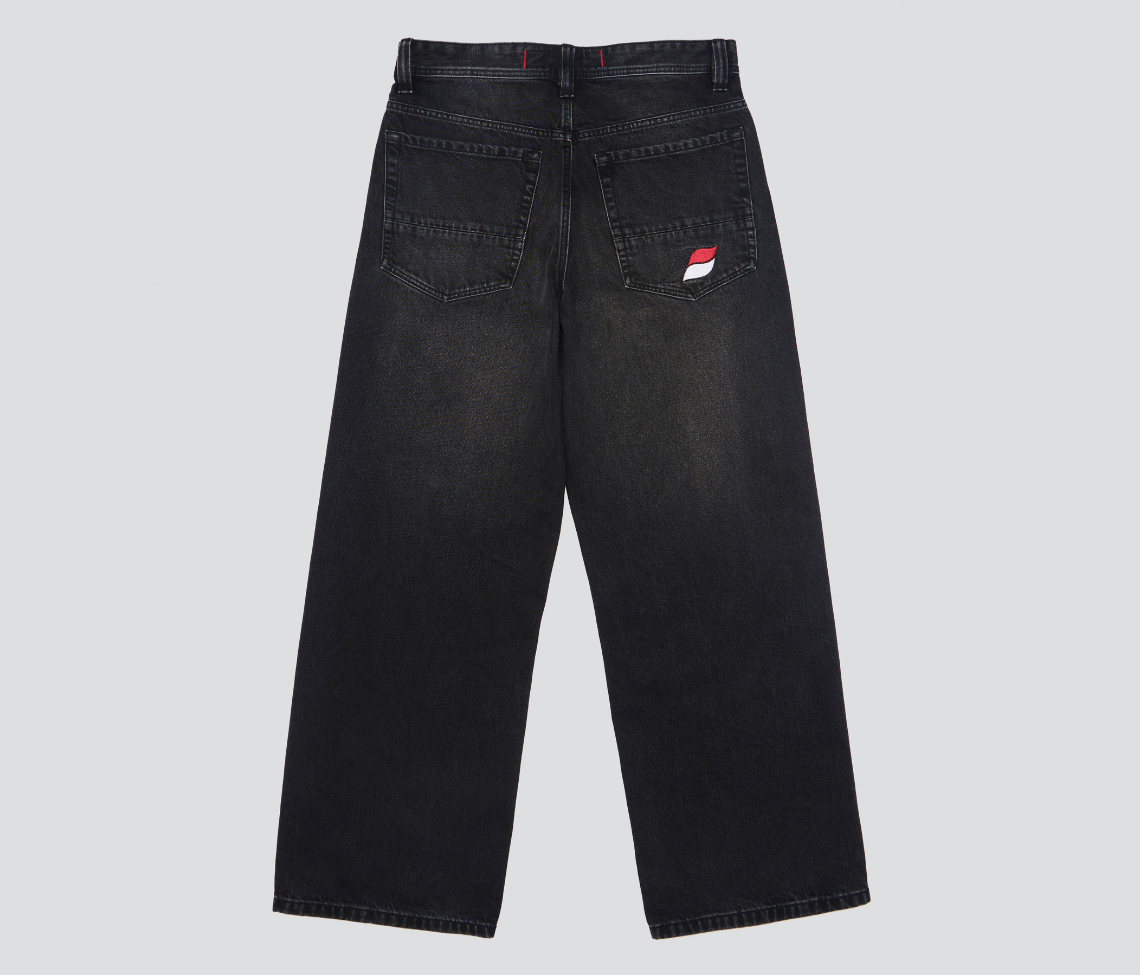 Sits below the waist with a longer rise. Baggy fit through the hip & thigh.