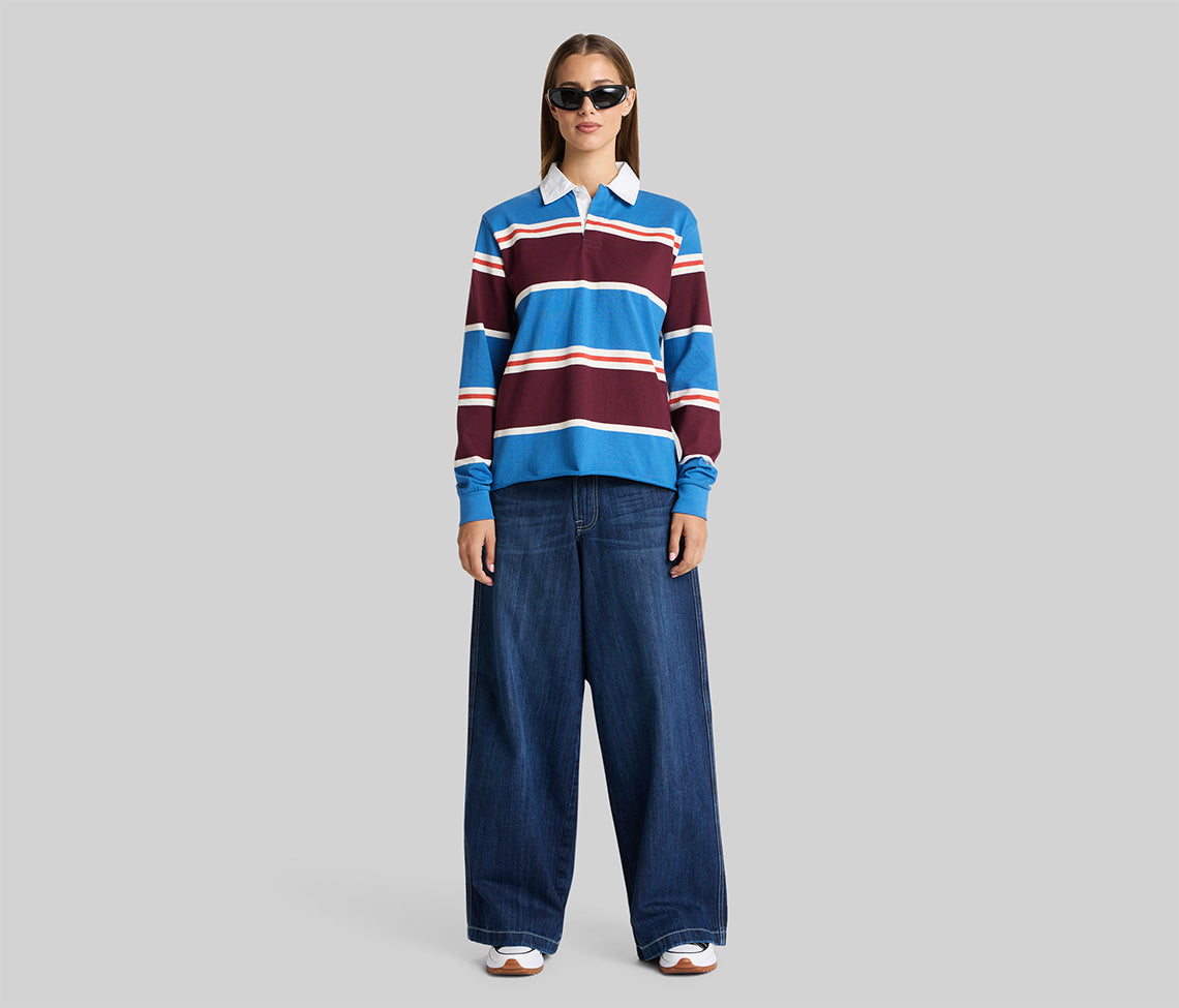 Sits below the waist with a longer rise. Baggy fit through the hip & thigh.
