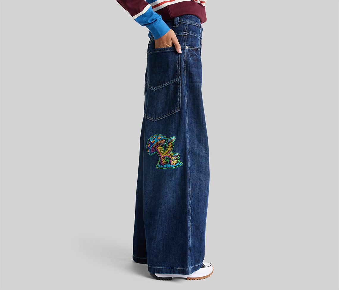 KIK WEAR K MUSHROOM-Embroidery below right back pocket.
