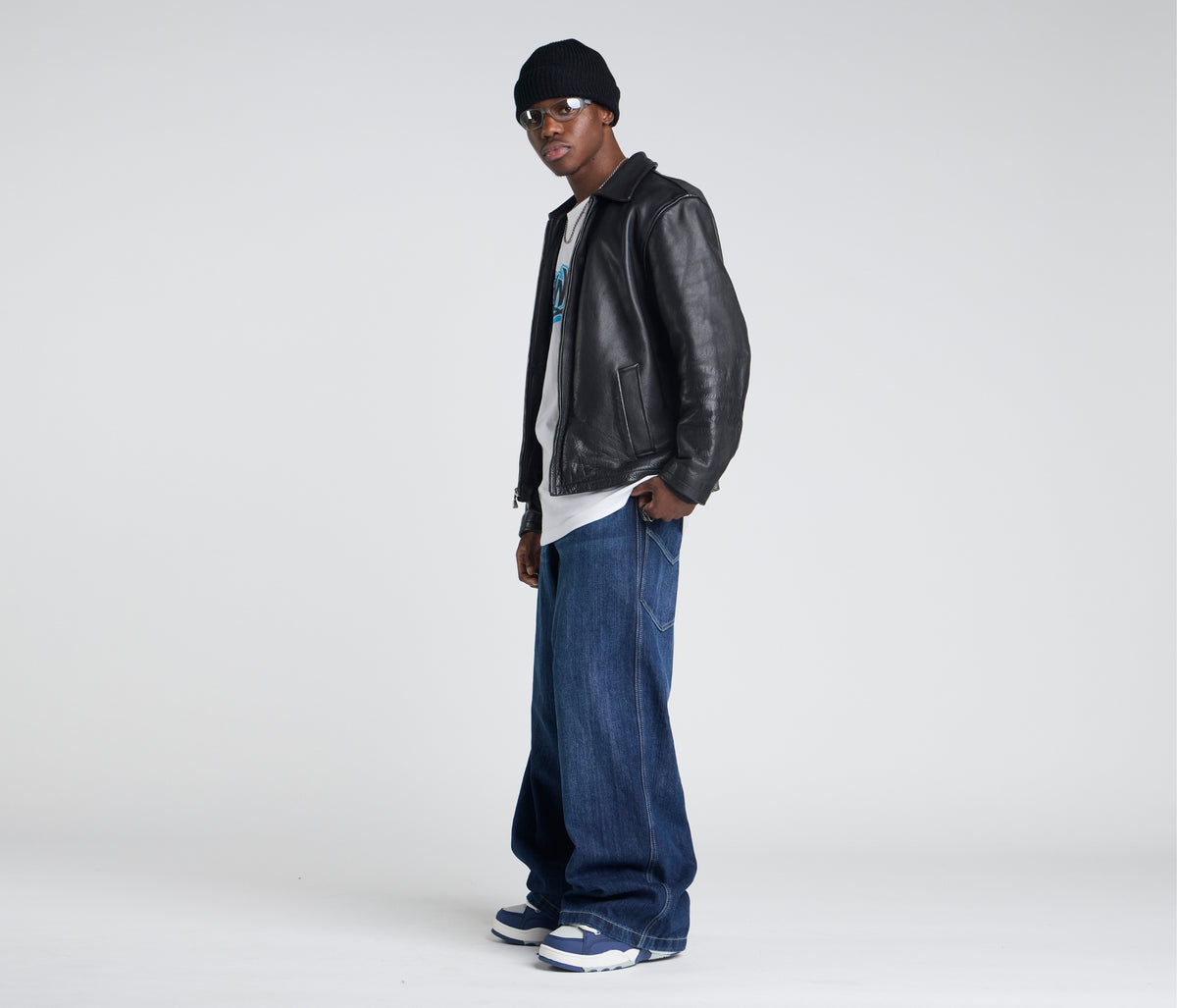 Sits below the waist with a longer rise. Baggy fit through the hip & thigh.