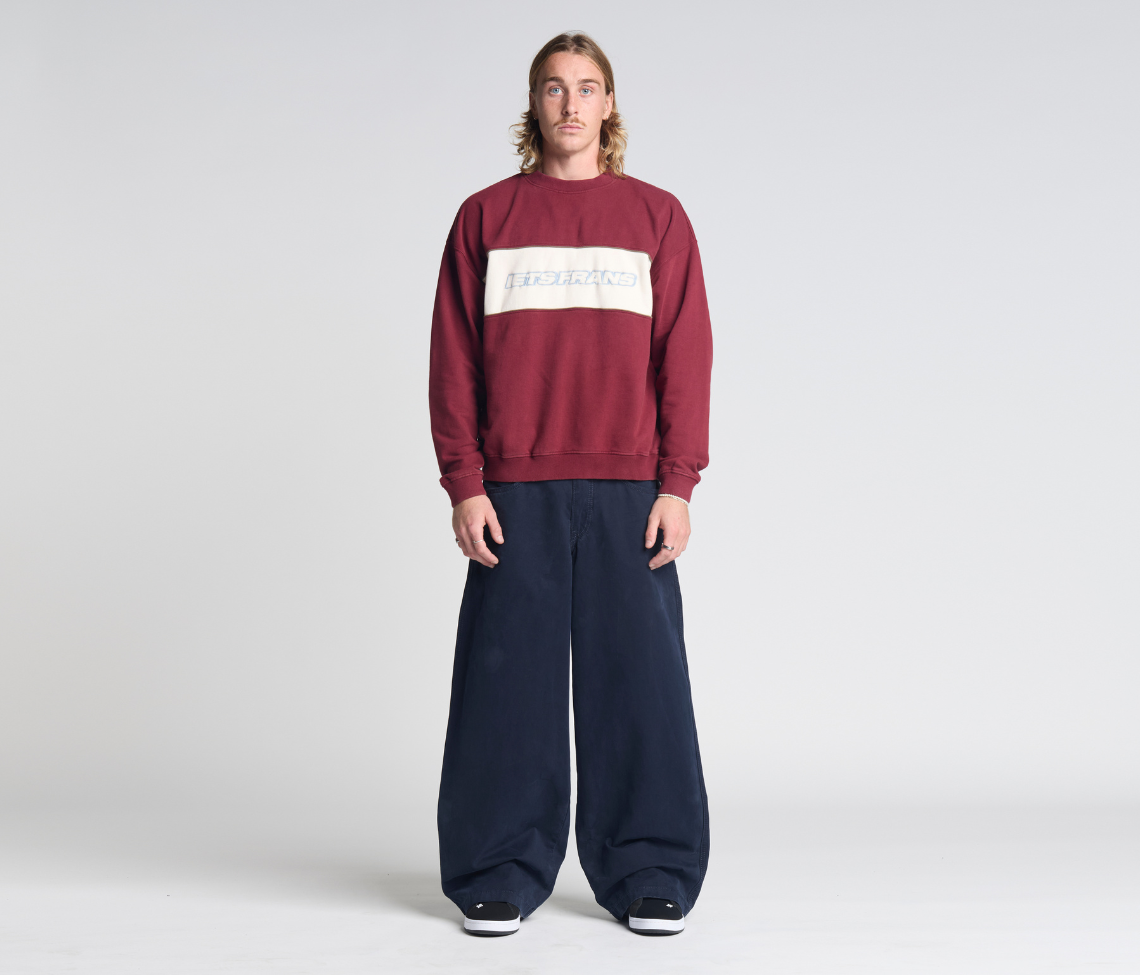 Sits below the waist with a longer rise. Baggy fit through the hip & thigh.