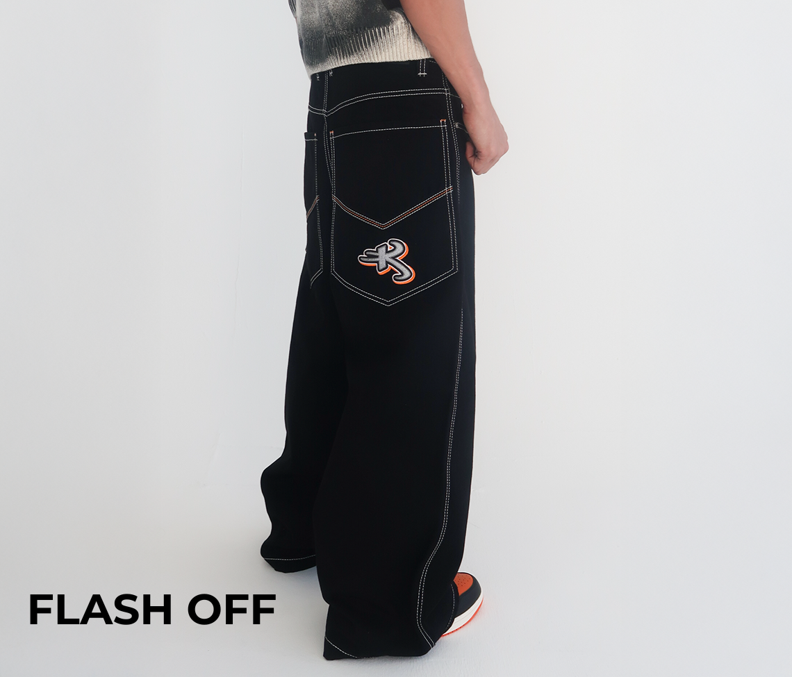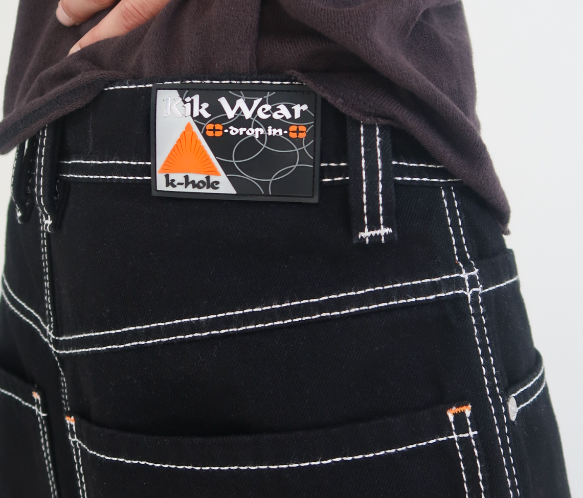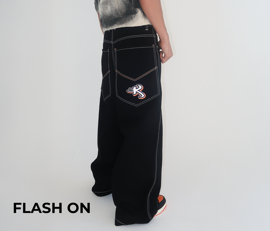 Hidden Stash Pocket | 26" Bottom Leg Opening | Super Black Rinse Wash | Reflective Embroidery
