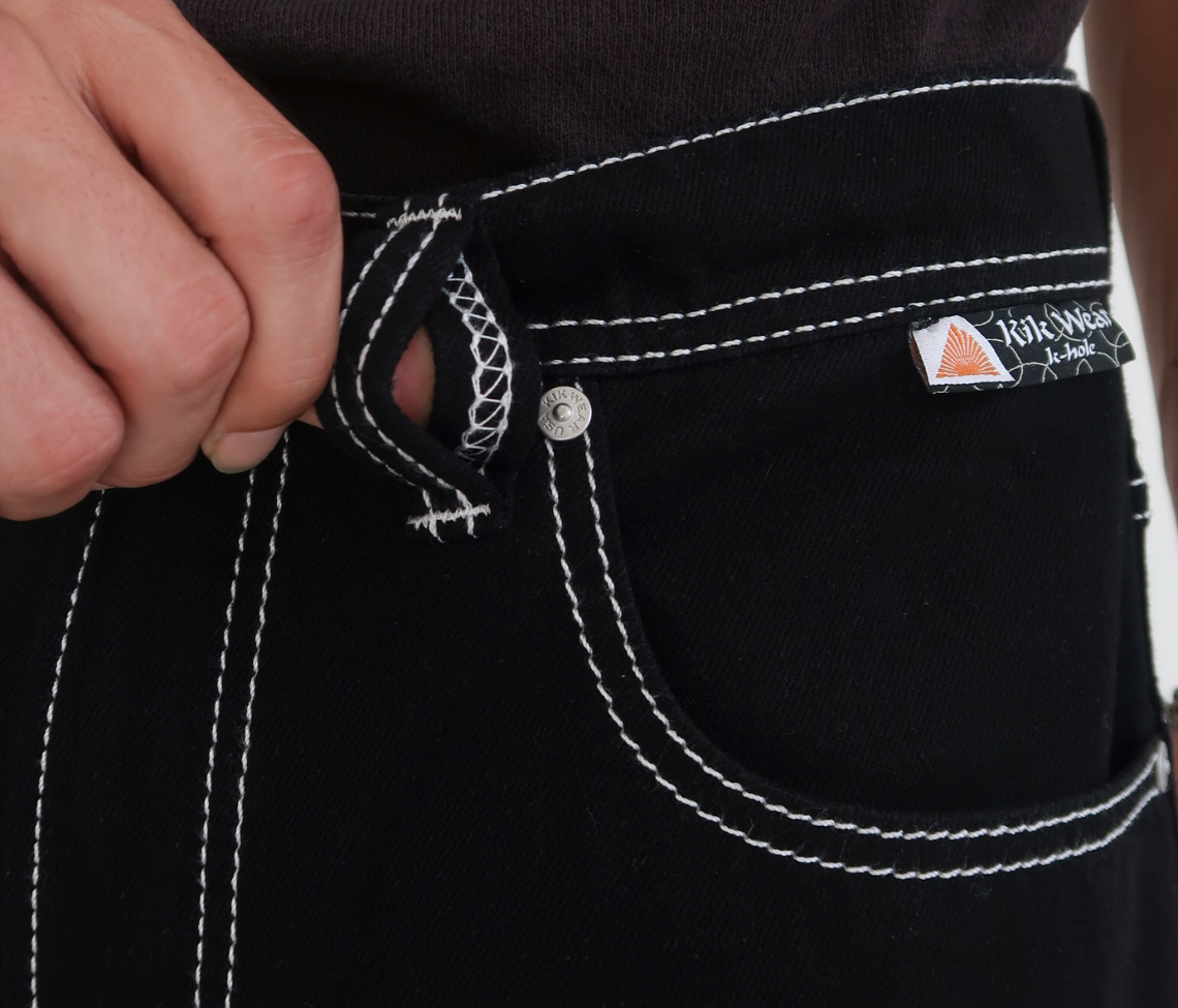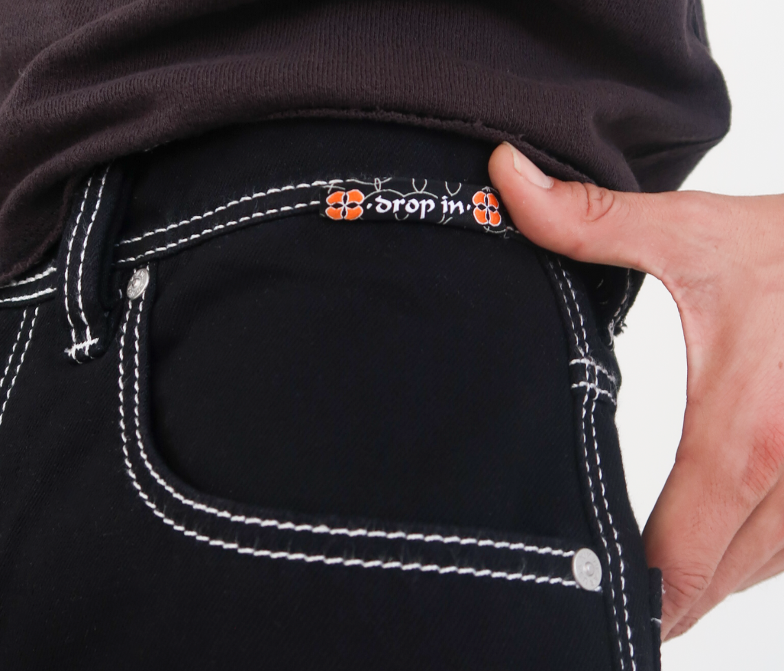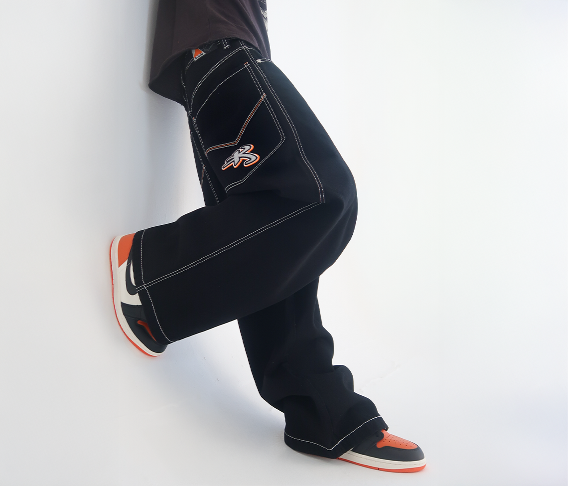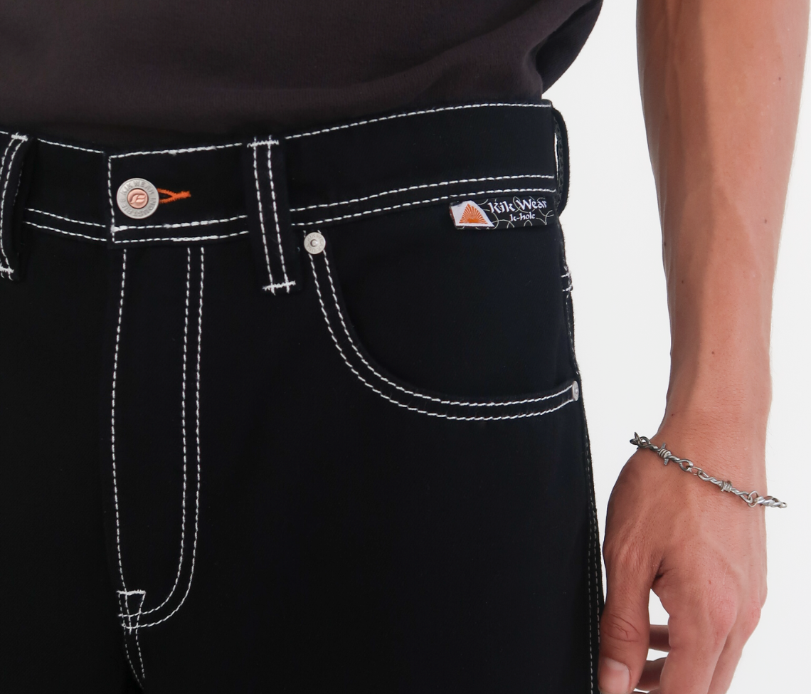 Hidden Stash Pocket | 26" Bottom Leg Opening | Super Black Rinse Wash | Reflective Embroidery