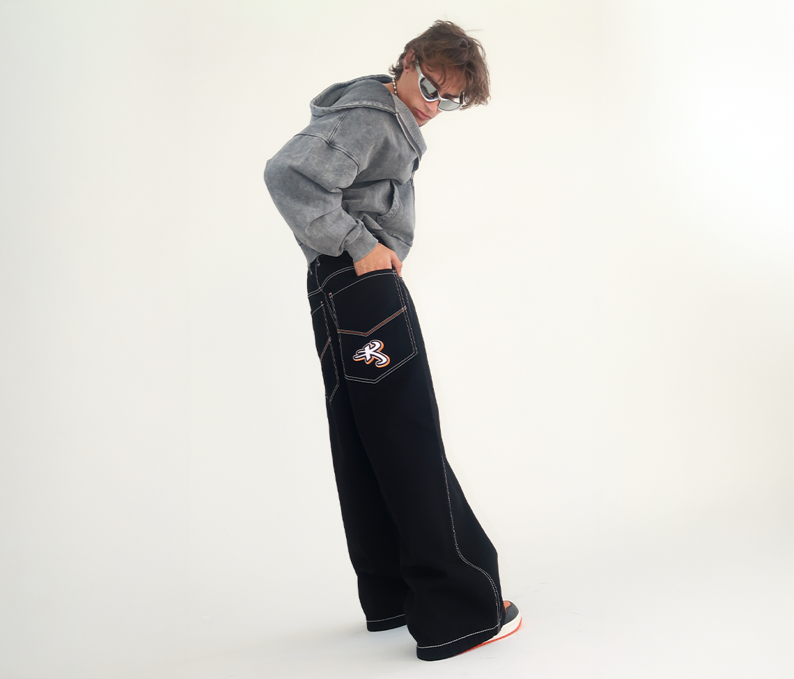 Sits below the waist with a longer rise. Baggy fit through the hip & thigh.