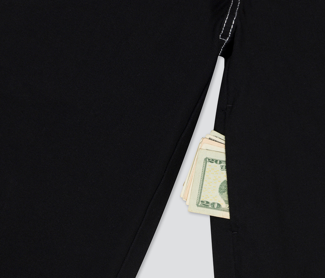 Hidden pockets, good length, and deep pockets. It’s comfy while looking good. Also good stack and sits good on shoes